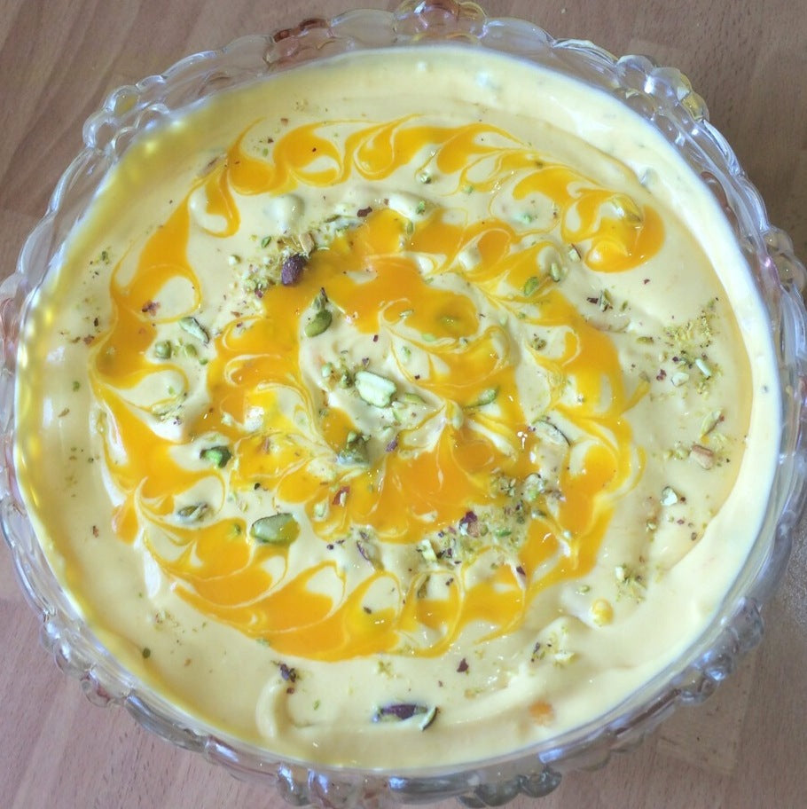 6. Decorate with swirls of mango pulp and the remaining chopped pistachios.