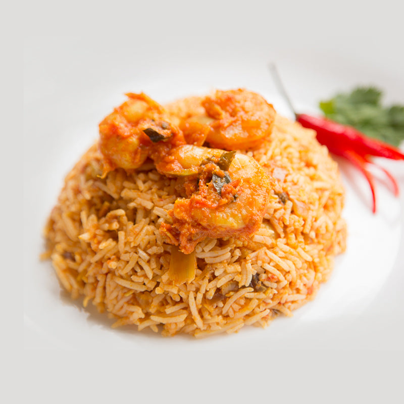 5. For mixing the prawns to the rice, transfer the rice into a large dish and add the spiced prawns. Gently fork through to mix well. The pulao can be reheated in the microwave if necessary.